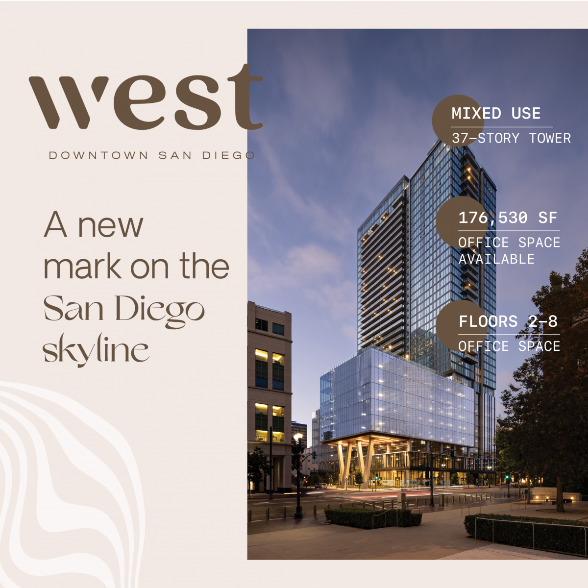 Elevate your business at West: Downtown San Diego's 37-story marvel. 176,530 SF of premium office space meets unrivaled amenities. Rooftop pool, outdoor deck, fitness center, retail. Where ambition soars and success thrives. Secure your space now!
