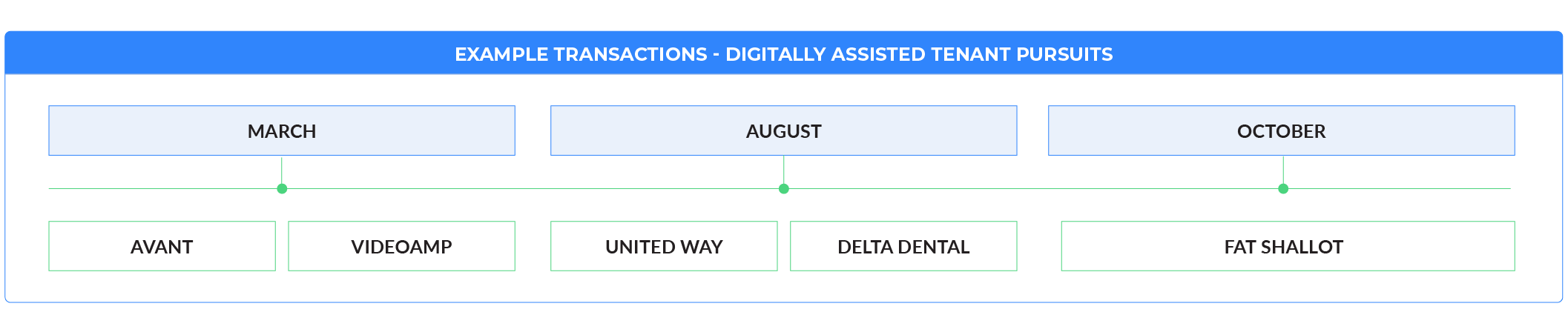 More specifically, Fintech powerhouse Avant signed a lease at theMART. This 81,340 SF lease was worth roughly $40,000,000. During the tenant pursuit and prior to lease execution, the decision-makers at Avant interacted with the building’s digital strategy (powered by RealtyAds) more than 495 times. This success would be replicated later that same month as VideoAmp announced it would join Avant in theMART with a 5-year lease. Consistent touches were made to decision-makers at VideoAmp from February to August, strategically getting the asset’s message in front of key audiences to advance the lease execution.
